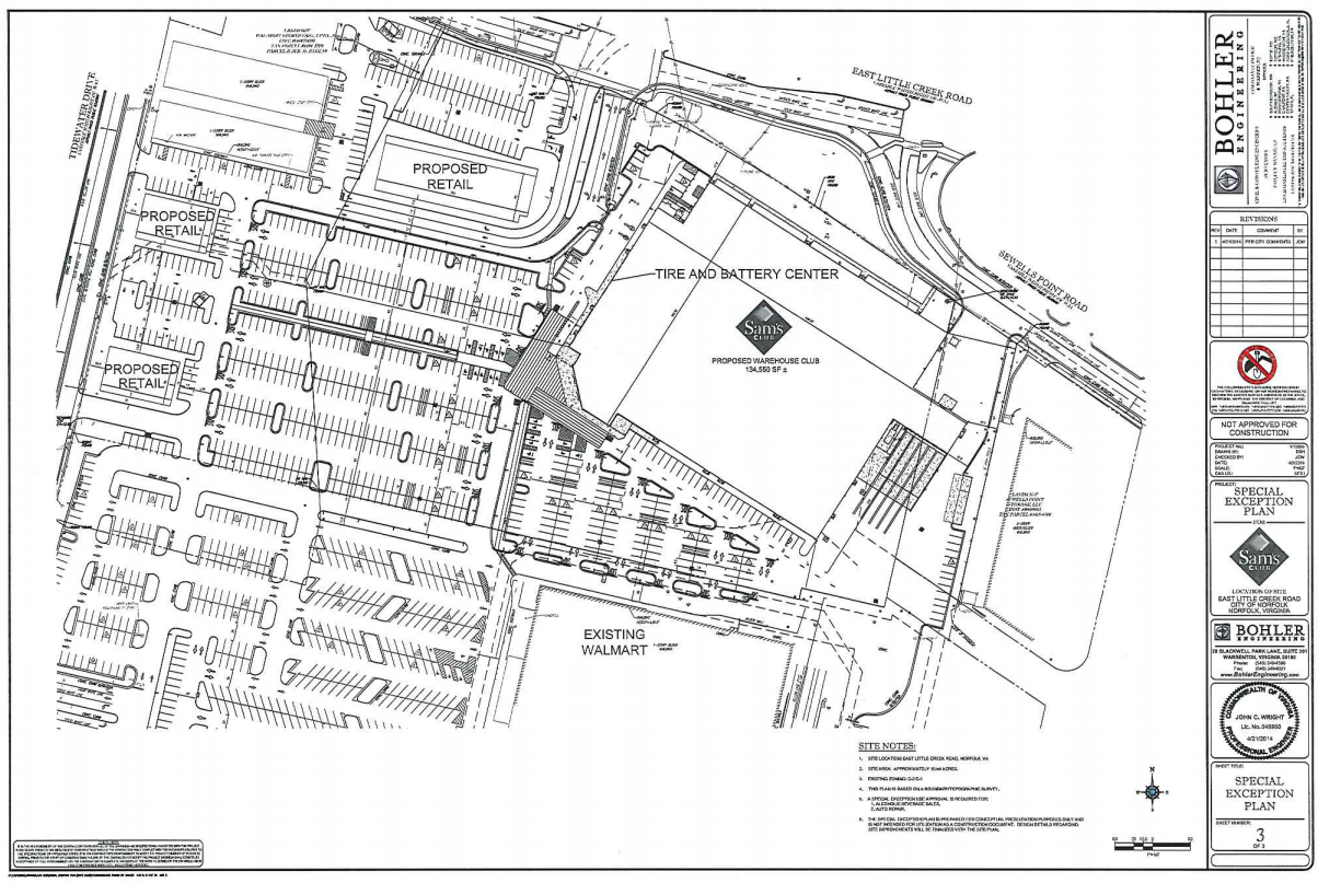 The new Sam’s Club slated for the old K-Mart location at the intersection of E. Little Creek Road and Tidewater Drive has applied for special exceptions to sell alcohol, to do automobile repair (tire sales and service), and to operate a gas station.