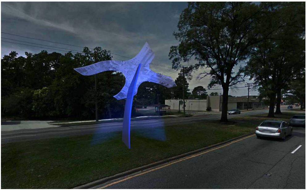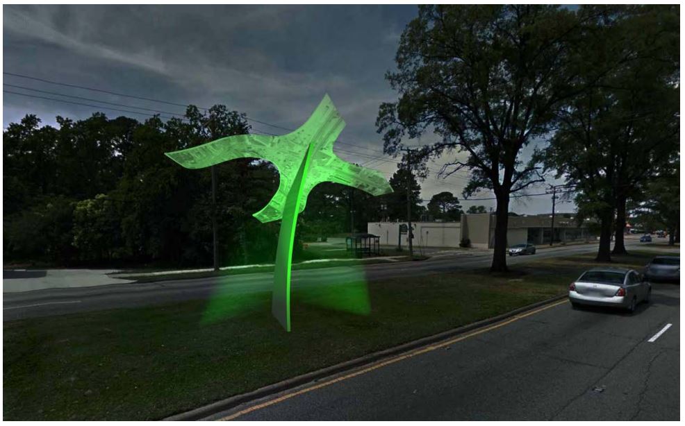 The art is constructed with a stainless steel base and a 1-inch thick acrylic with a historical map of Wards Corner applied to the inside surface. While the art is shaped like the Wards Corner intersection of Granby St and Little Creek Road, it also can appear like a bird in flight. It is planned to be 15 feet tall and have a 12 foot “wingspan”.