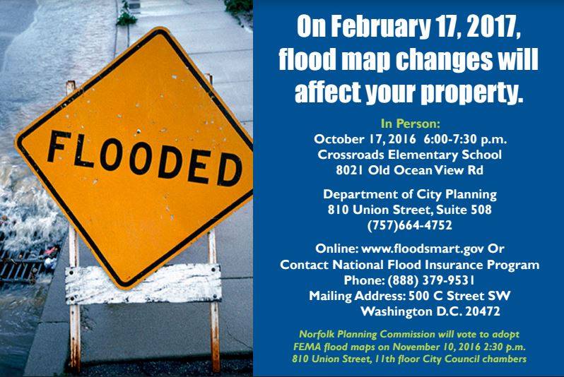 FEMA is updating their flood maps and the changes will impact many properties in Norfolk. If it affects your property you should have received the attached postcard. Find out if you are in a flood zone on the new maps here: http://www.norfolk.gov/firmupdate